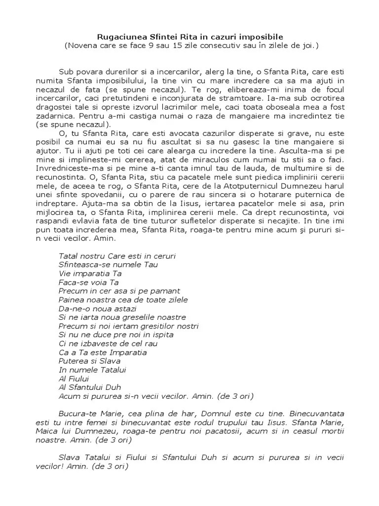 Sub povara durerilor şi a încercărilor, alerg la tine, o sfântă rita, care eşti numită sfânta imposibilului, la tine vin cu mare încredere ca să ma. (sfânta făcătoare de minuni imposibile 22 mai) novenă care se face 9 sau 15 zile consecutiv sau în zilele de joi. 22.05.2016 · rugăciunea sfintei rita în cazuri imposibile. Rugăciunea de început şi rugăciunea de încheiere se recită în fiecare din cele nouă zile, la începutul, respectiv la sfârşitul rugăciunii zilei respective. Putem recita cununa de … Putem recita cununa de rugăciuni ori de câte ori avem nevoie de. Putem recita cununa de rugaciuni ori de câte ori avem nevoie de ajutoare trupesti sau sufletesti. 27.10.2018 · lasati nume si ce doriți pentru a uni 2 persoaneiubita servitoare a cerurilor sf.
