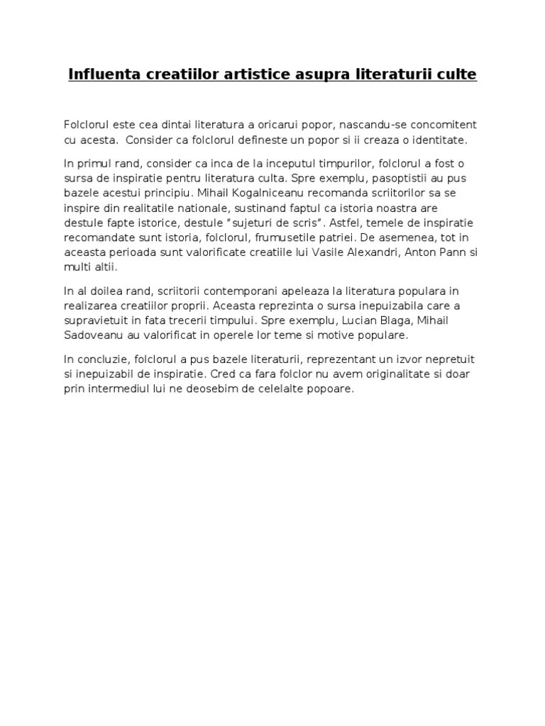 Demonstrati cu doua argumente relatia dintre literatura populara si cea culta... Diferenta dintre literatura populara si cea culta. Toate imaginile, textele sau alte materiale prezentate pe site sunt proprietatea referat.ro fiind interzisa reproducerea integrala sau partiala a continutului acestui site pe alte siteuri sau in orice alta forma fara acordul scris al … Asa se explica faptul ca multe opere culte au ca izvor de insptatie creatia populara, pornind de la diferite teme sau motive ale acesteia.
